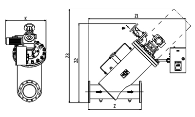 | 型號(hào) | 管徑 | 出入水口 | Z | Z1 | Z2 | Z3 | K | 濾網(wǎng)面積 | 處理水量 | 重量 |